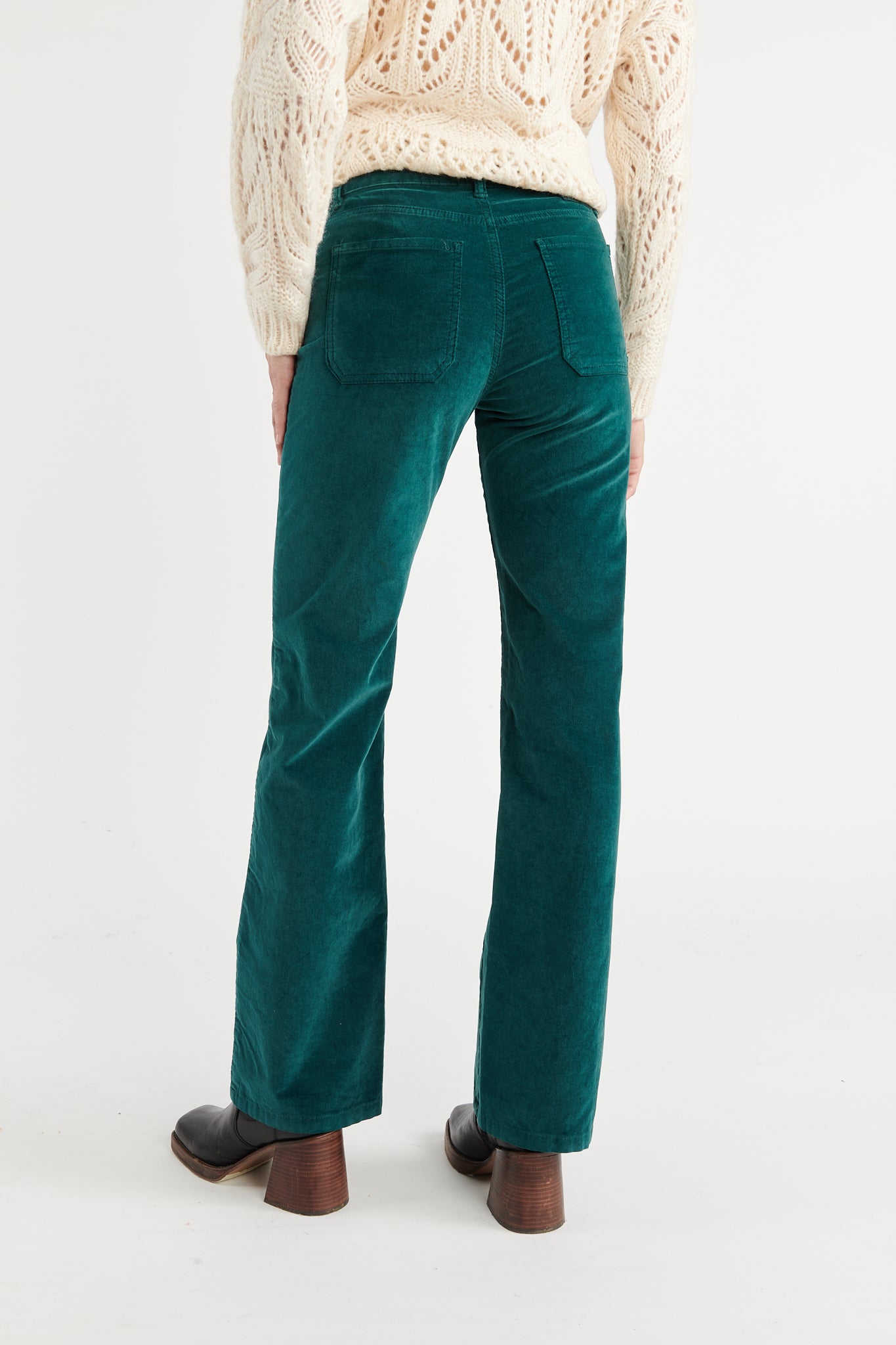 Anouck dispose d'une matière velours lisse inspirée des années seventies. Avec sa taille mi-haute, ses poches plaquées, sa coupe flare et sa matière élastiquée, il sublime la silhouette tout en offrant une grande liberté de mouvement. Sa couleur vert forêt est parfaite pour la saison Automne/Hiver. Associez-le avec la veste Betsy de la même gamme.