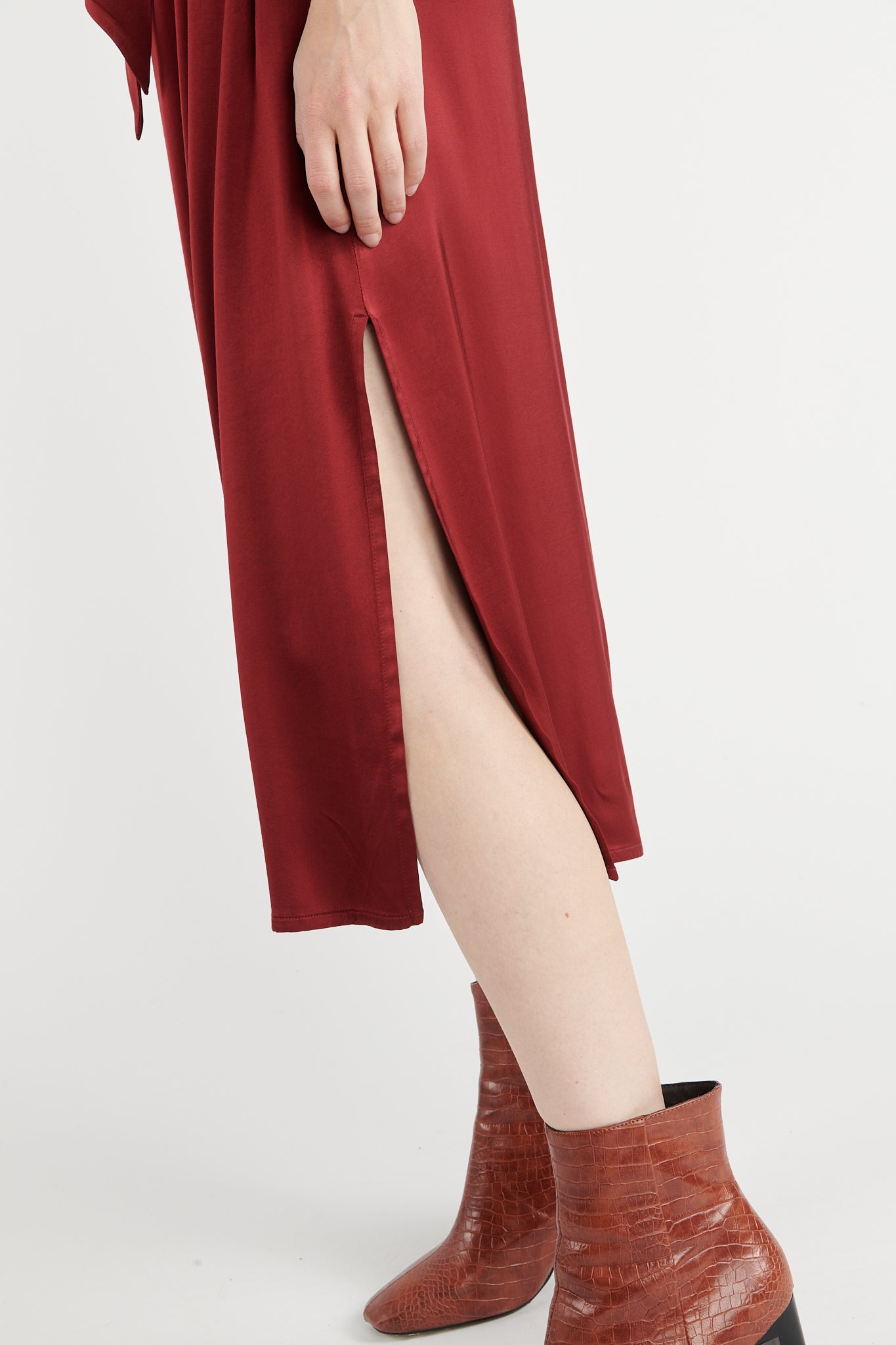 Berylla est une robe en satin élégante. Avec sa longueur mi-longue, ses manches 3/4 et sa fente latérale, cette robe en viscose naturelle vous offrira un look à la fois sophistiqué et confortable. À nouer à l'avant ou à l'arrière, choisissez votre style et profitez de sa belle couleur grenade pour égayer votre garde-robe.