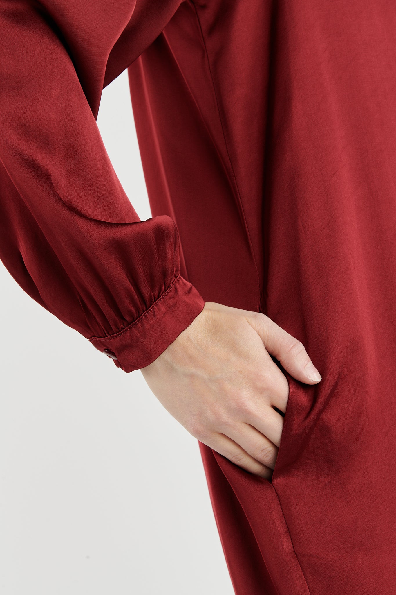 Cette robe courte et satinée se démarque par son irrésistible coloris grenade. Longueur genou, matière fluide et manches longues ce sont les détails qui définissent la robe Britney. On adore la porter ceinturé pour ajouter de la dimension à sa coupe droite. Confectionnée en fibres naturelles, ce modèle est en 100% viscose.