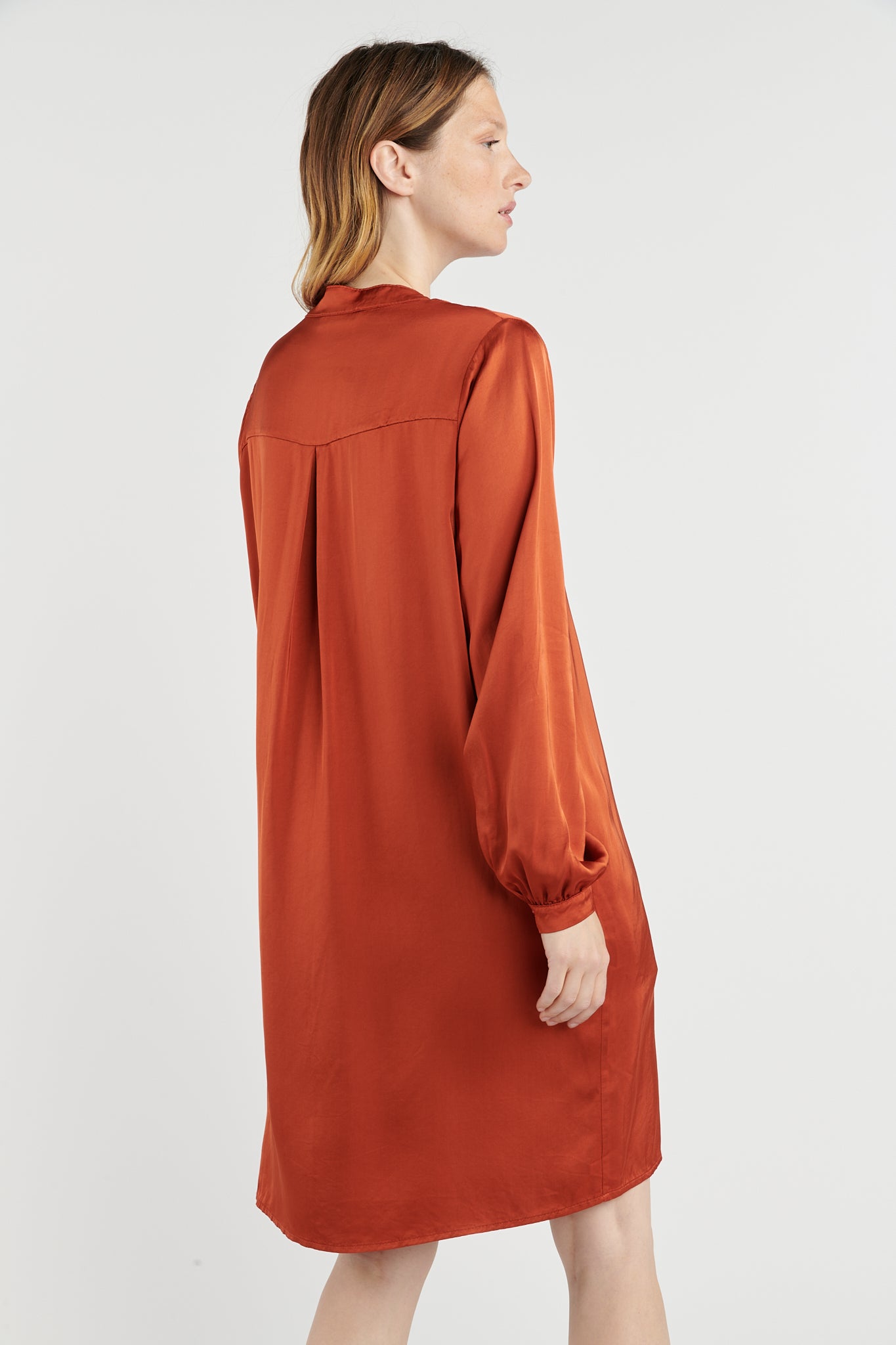 Britney est une irrésistible robe satinée coloris orange brulé. Elle dispose d'une coupe droite & fluide, des manches longues resserrées aux poignets et un col tunisien ouvert. Vous adorerez la porter ceinturée pour l'ajuster à la taille. Fabriquée en 100% viscose naturelle, elle allie confort et élégance.