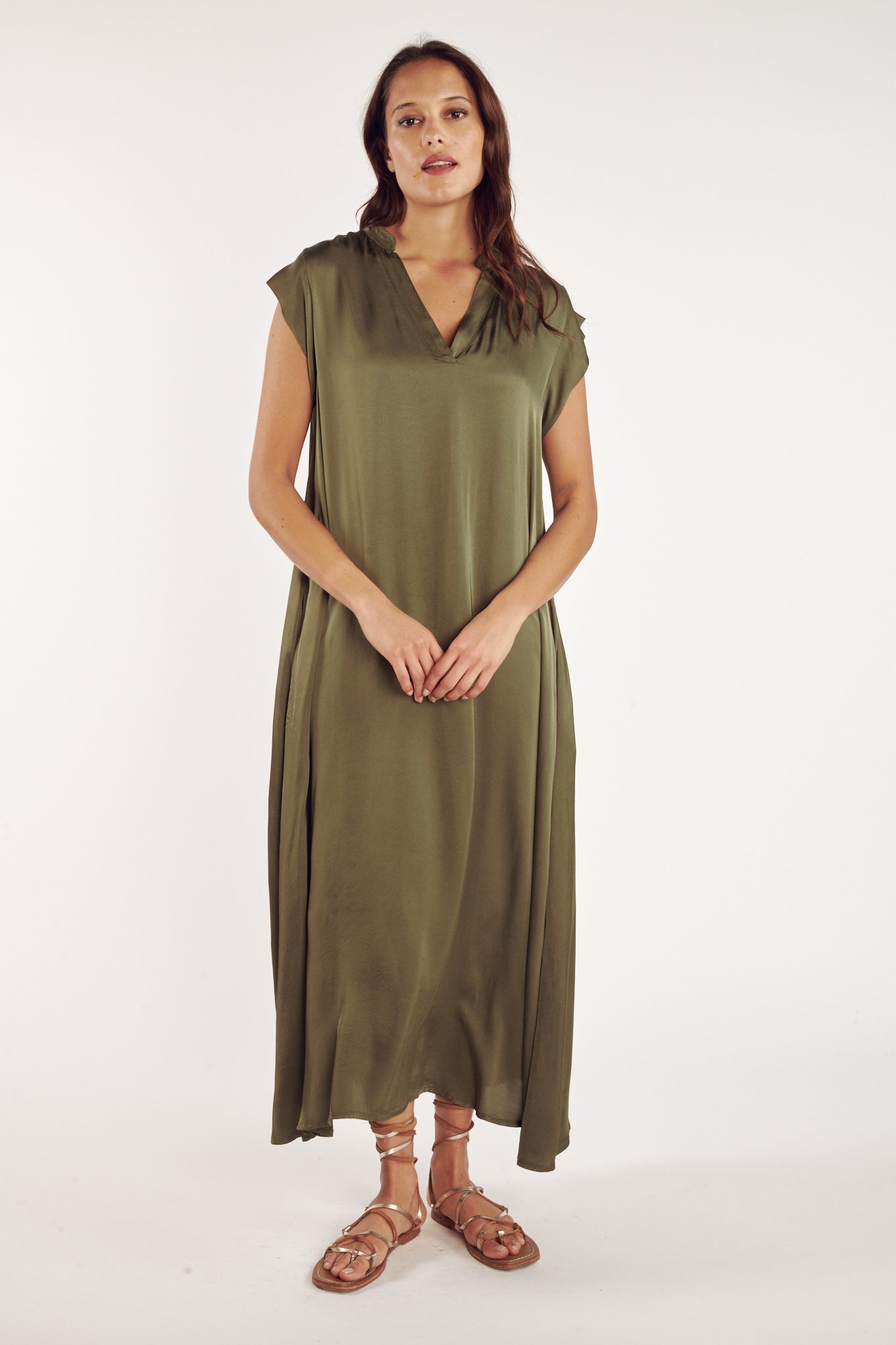 La robe longue Arlène adopte une coupe ample, un col en V mao, des manches courtes qui tombent légèrement sur les épaules et des poches latérales super pratiques. Sa matière 100% viscose est légère et agréable au contact de la peau, ce qui en fait un modèle incontournable de la garde-robe estivale. En journée ou en soirée, le modèle kaki s'adapte à toutes les occasions.