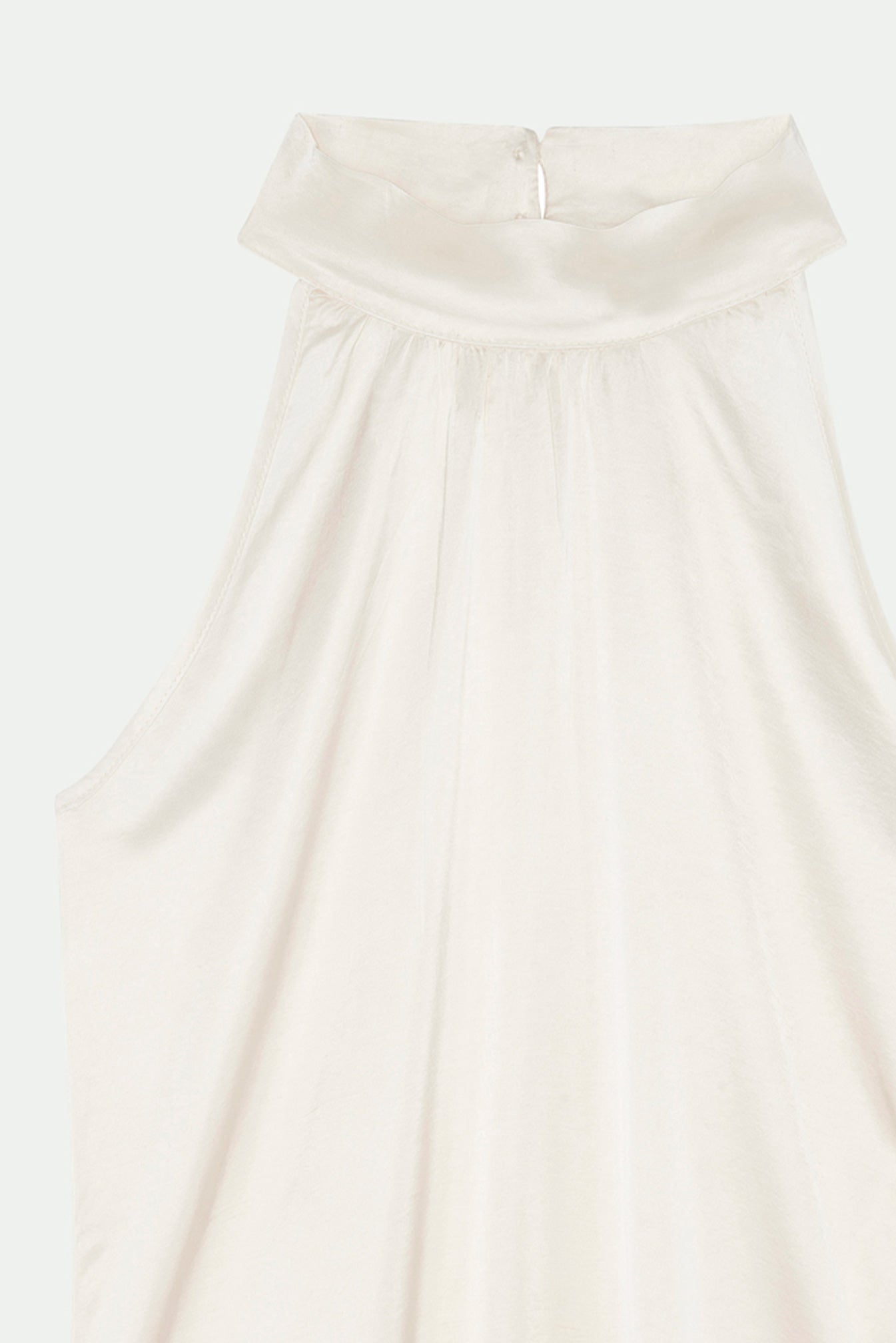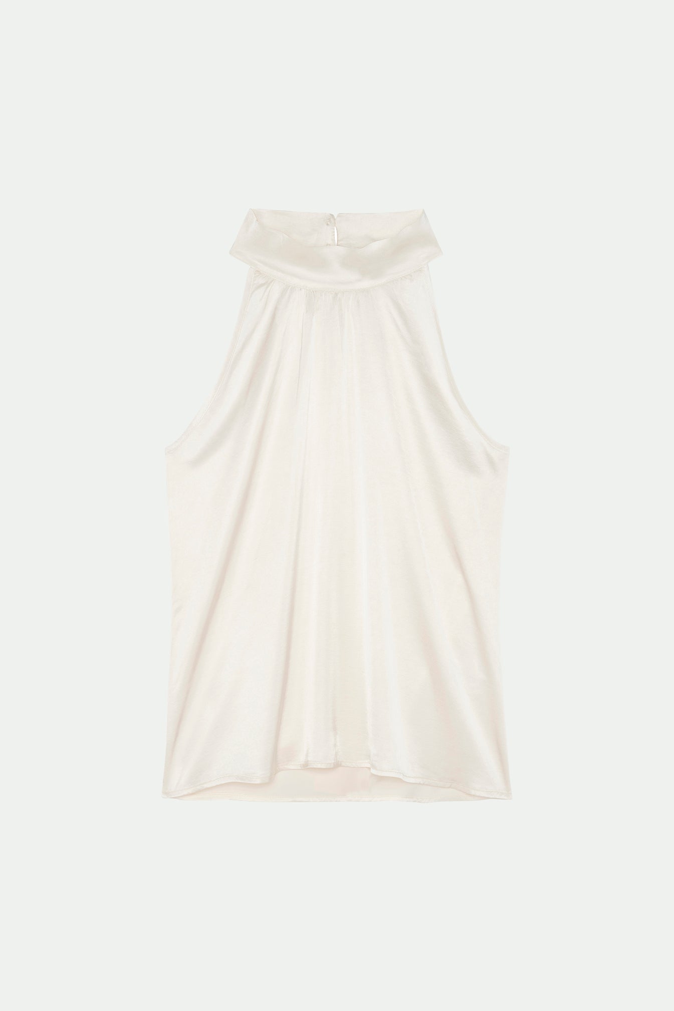 Pour un look élégant et satiné, on opte pour le top col montant Blandine ! De couleur naturel, il dispose d'un irrésistible détail goutte d'eau à l'arrière ainsi qu'une fermeture boutonnée dans le cou. En 100% viscose, ce top se porte facilement pour une soirée chic.