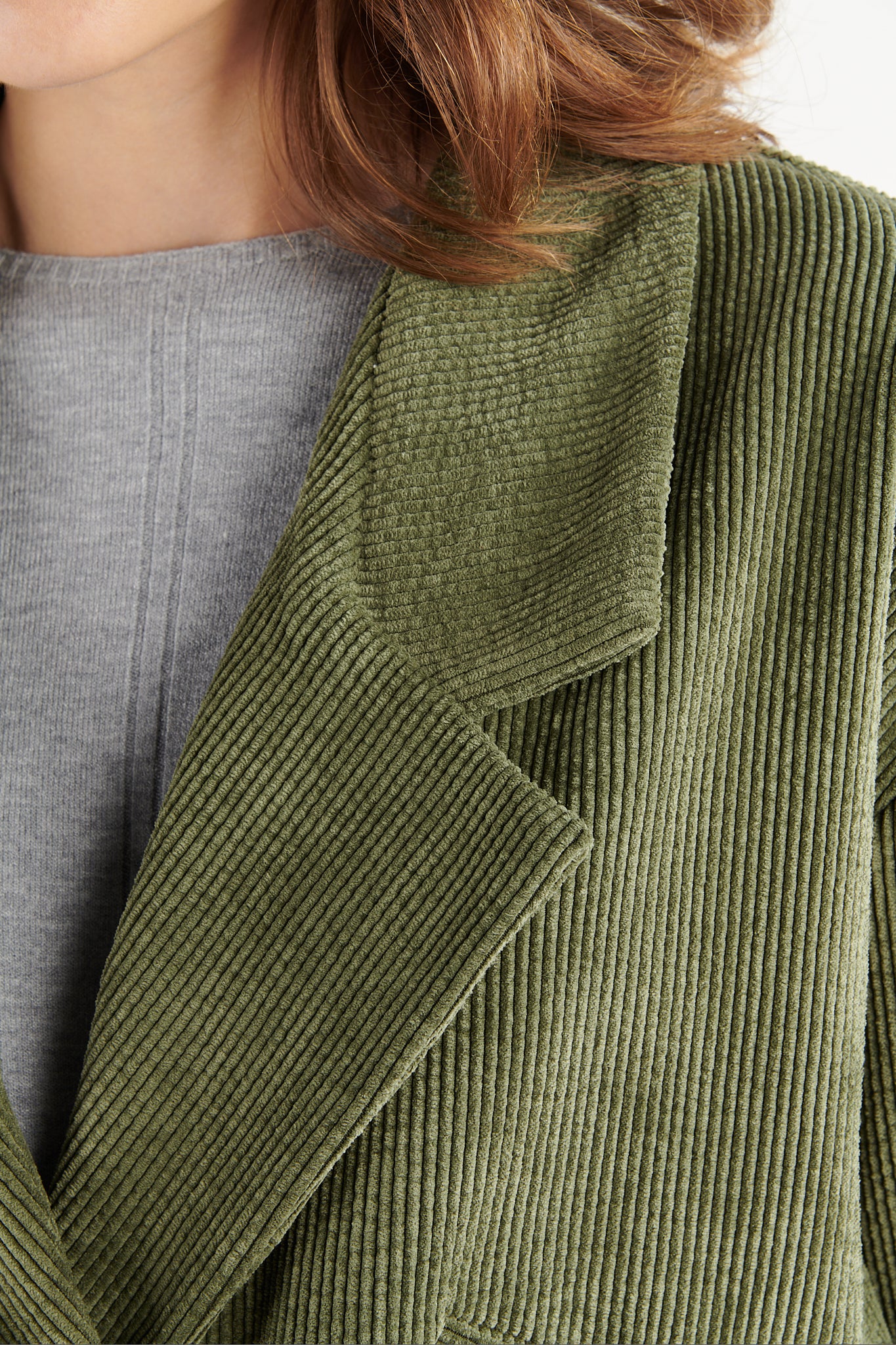 La veste Bloom est un modèle décontracté et tendance. Avec son col en V cranté, sa taille élastiquée et son double boutonnage à l'avant on craque totalement pour ce modèle. Confectionnée dans un velours côtelé épais de couleur kaki, elle offre un confort optimal et un style élégant, idéal pour les journées fraîches. Associez là avec un pantalon en velours Bréanne ou Brandon.