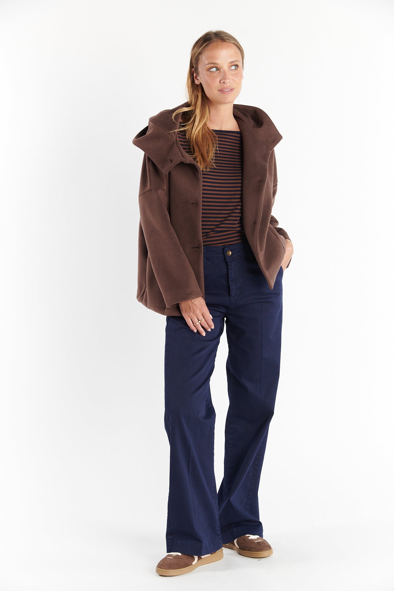 Chaleur et élégance sont au rendez-vous avec le caban court à capuche . Conçu dans une matière douce et épaisse, il offre une coupe ample et moderne, parfaite pour les journées fraîches d’automne ou d’hiver. Son large col transformable en capuche enveloppe délicatement le cou et apporte une touche décontractée chic. La coupe oversize, les manches légèrement tombantes et les poches latérales en font une pièce aussi pratique que tendance. Facile à associer, il se porte aussi bien sur un jean que sur une tenue habillée pour un look citadin et sophistiqué.