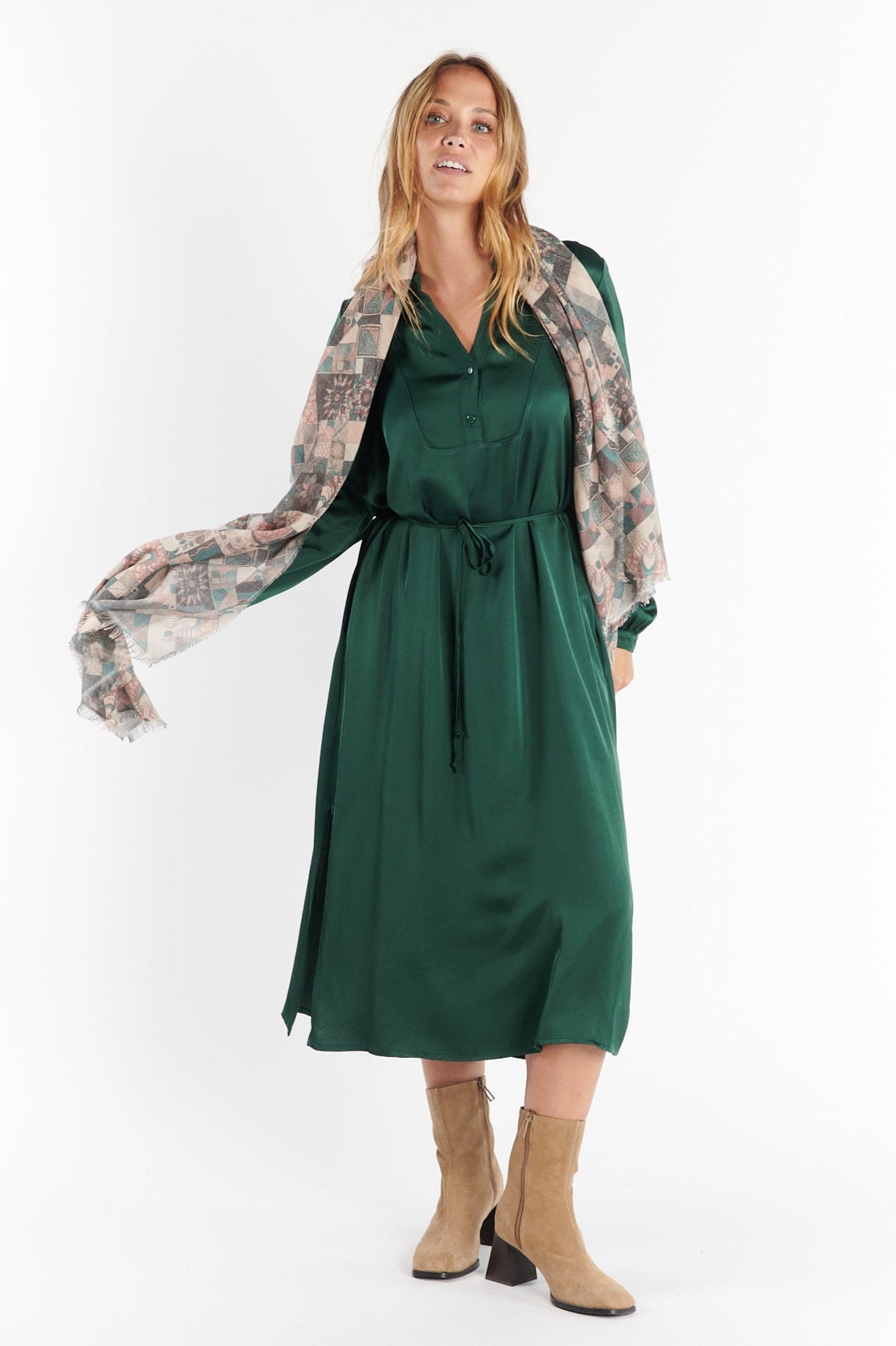 Le chèche Dastan se distingue par son imprimé mosaïque sur fond vert, à la fois doux et élégant. Ses bords délicatement frangés ajoutent une touche de légèreté et de style. Avec ses dimensions généreuses (180 x 70 cm), il peut se porter de multiples façons : enroulé et noué autour du cou ou bien posé sur les épaules. Un accessoire facile à associer qui complète aussi bien une tenue casual qu’un look plus habillé.