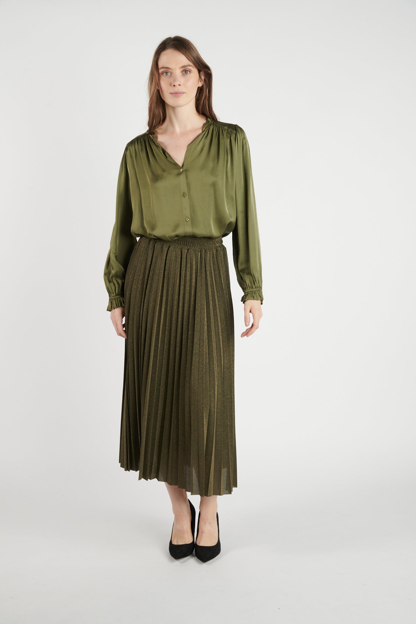 Apportez une touche de charme et de modernité à vos looks avec la jupe Daryna. Réalisée dans une matière fluide rehaussée de fines paillettes, elle séduit par sa coupe plissée qui bouge avec légèreté. Sa taille haute élastiquée offre un confort idéal tout en valorisant la silhouette. Mi-longue et entièrement doublée pour un joli tombé, elle s’adapte à toutes les occasions. Sa nuance kaki apporte une note tendance et sophistiquée, faisant de cette jupe une pièce phare du dressing féminin.