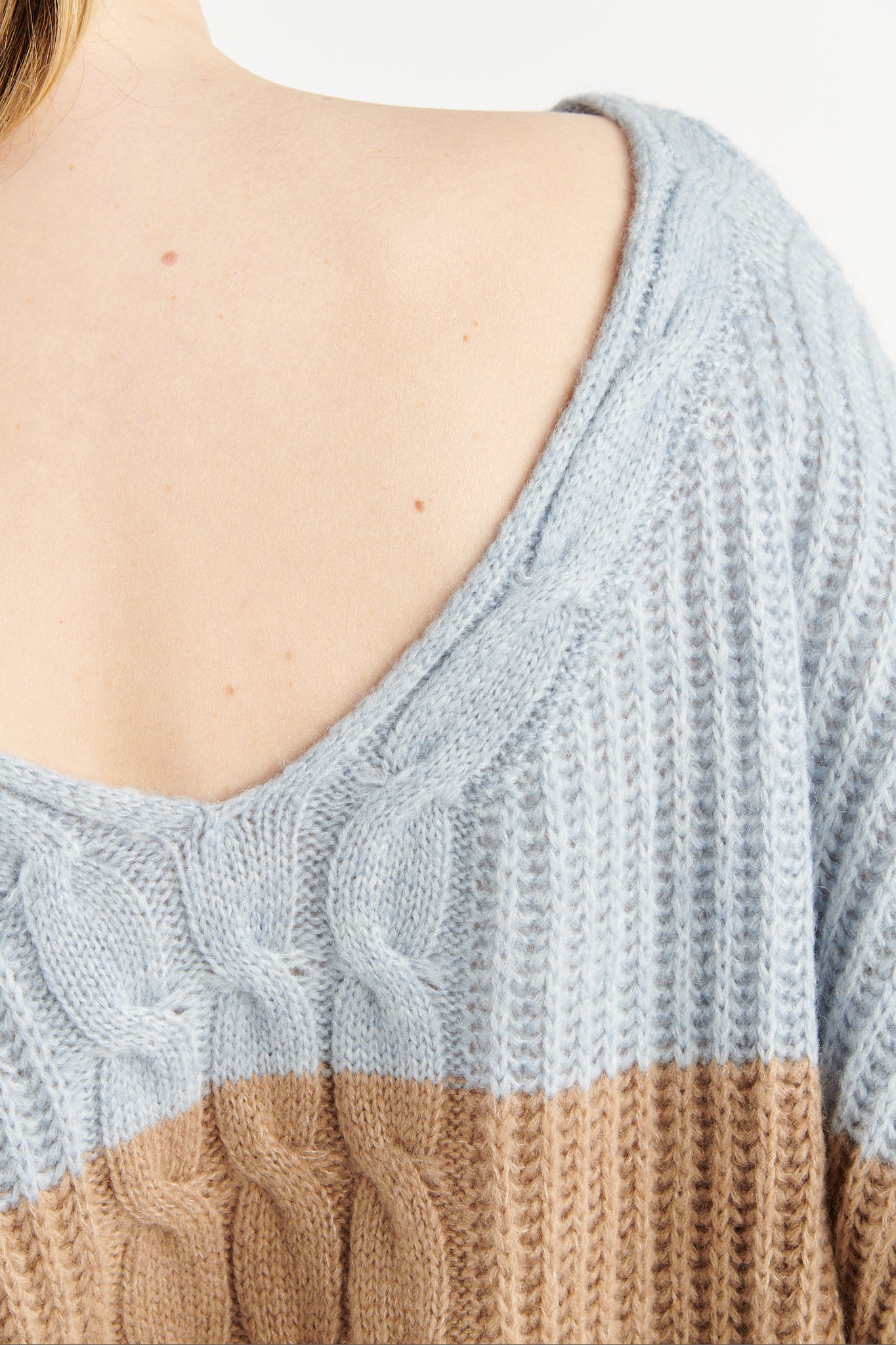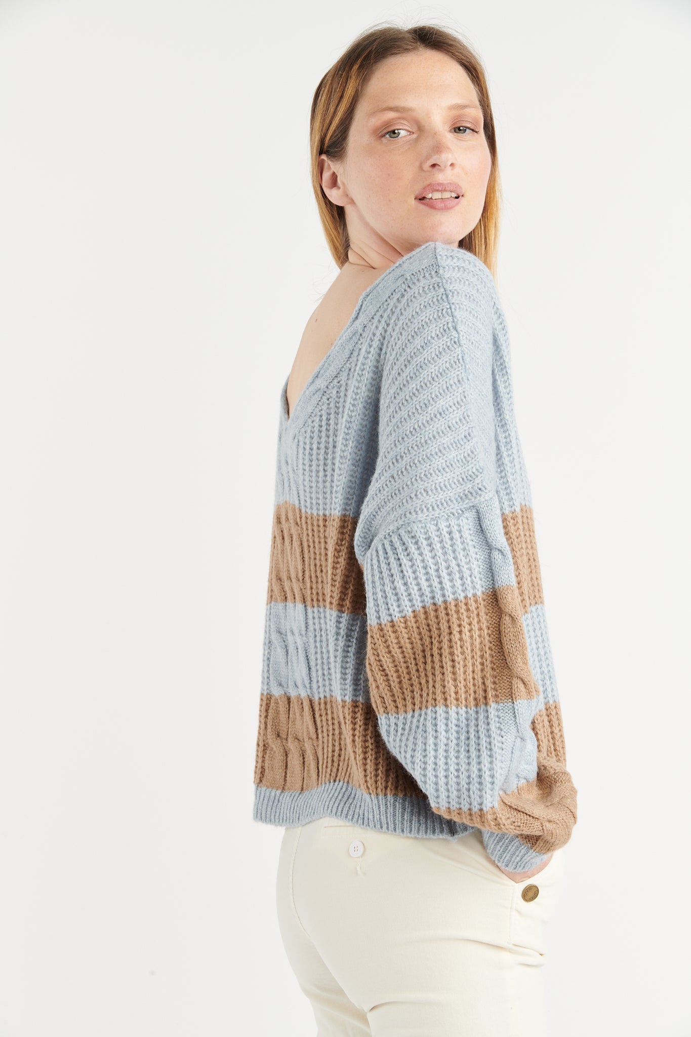 Élégant et plein de féminité, le pull Biatriz est un véritable coup de cœur. Son encolure en V dans le dos, sublimée par un délicat détail tressé, en fait une pièce résolument tendance. Ses rayures bleu ciel et camel se marient parfaitement avec un jean, un pantalon blanc ou noir, pour des looks modernes et faciles à porter.