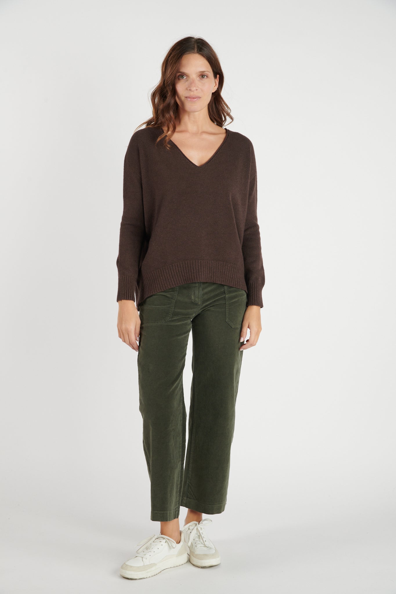 Le pull Dan, confectionné en maille légère et douce, s’impose comme un incontournable du quotidien. Il présente des manches longues, une encolure en V à effet brut et de délicats bords côtelés aux poignets et à la taille. Dans son coloris choco profond, il allie confort et élégance pour sublimer toutes vos tenues.