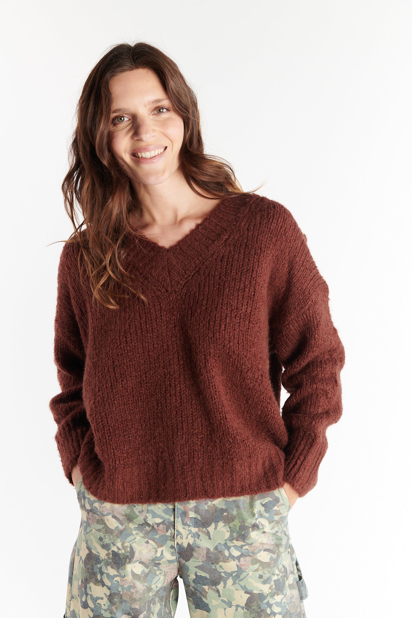 Le pull Delmi s’impose comme une pièce cosy et élégante grâce à sa maille épaisse et réconfortante. Ses manches longues et son col en V apportent une touche féminine et raffinée. Décliné dans une teinte paprika chaleureuse, il dynamise vos tenues tout en restant facile à associer. Un essentiel pour la saison hivernale.