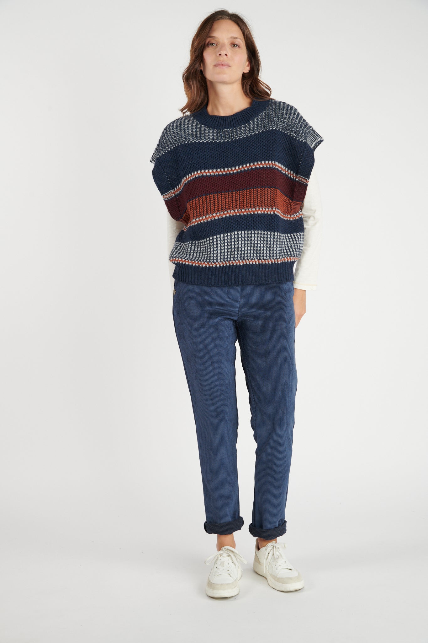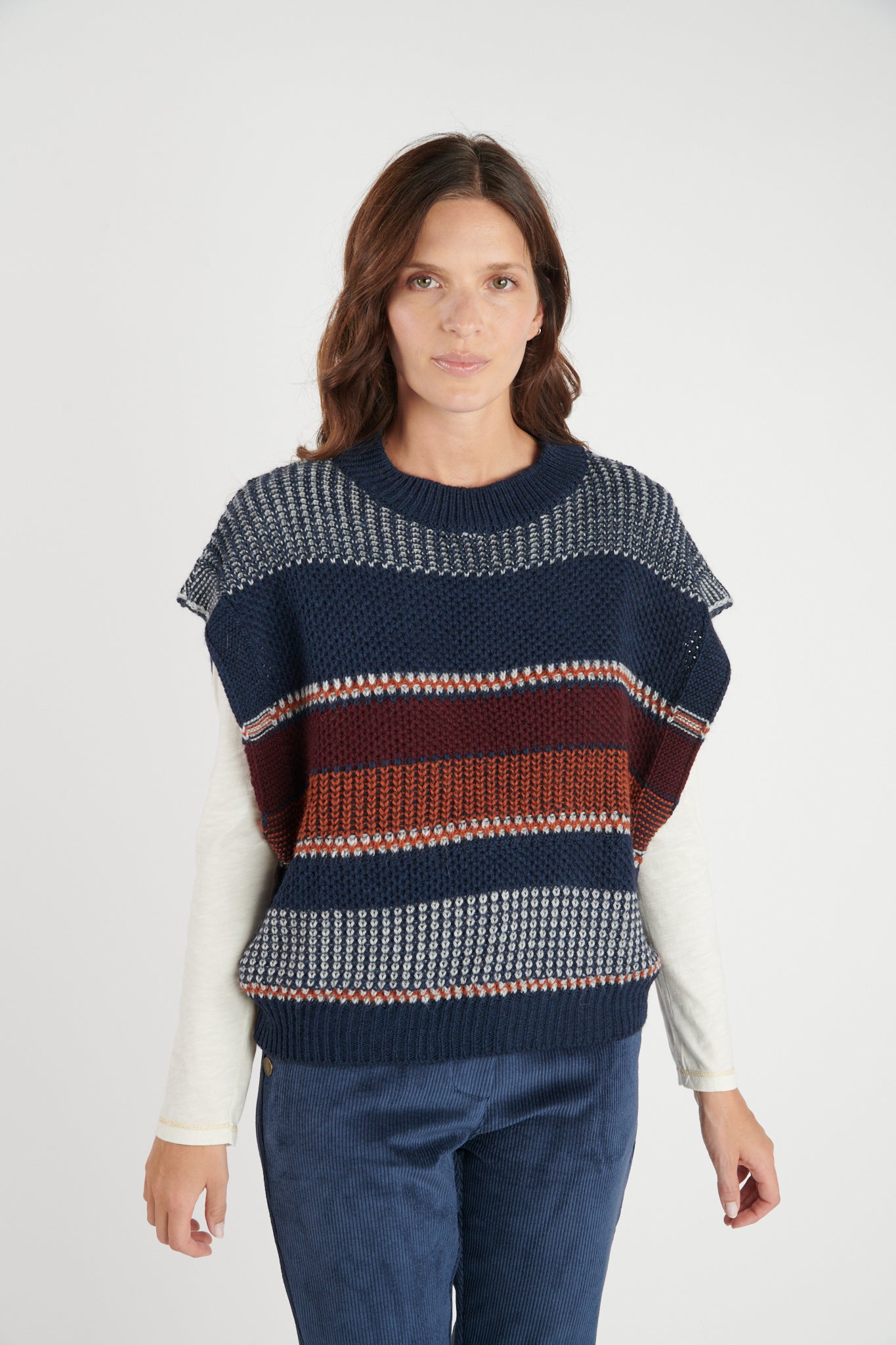 Le pull sans manches Danaé séduit par sa maille texturée et son jeu de rayures contrastées. Associant des tons marine, bordeaux, rouille et écru, il apporte une touche de couleur et de modernité à la silhouette. Son col rond et ses finitions côtelées renforcent son allure confortable et structurée. Parfait en superposition sur une chemise ou un sous-pull, il se porte facilement au fil des saisons pour un look à la fois décontracté et raffiné. Une pièce pleine de caractère, idéale pour réchauffer vos tenues du quotidien.