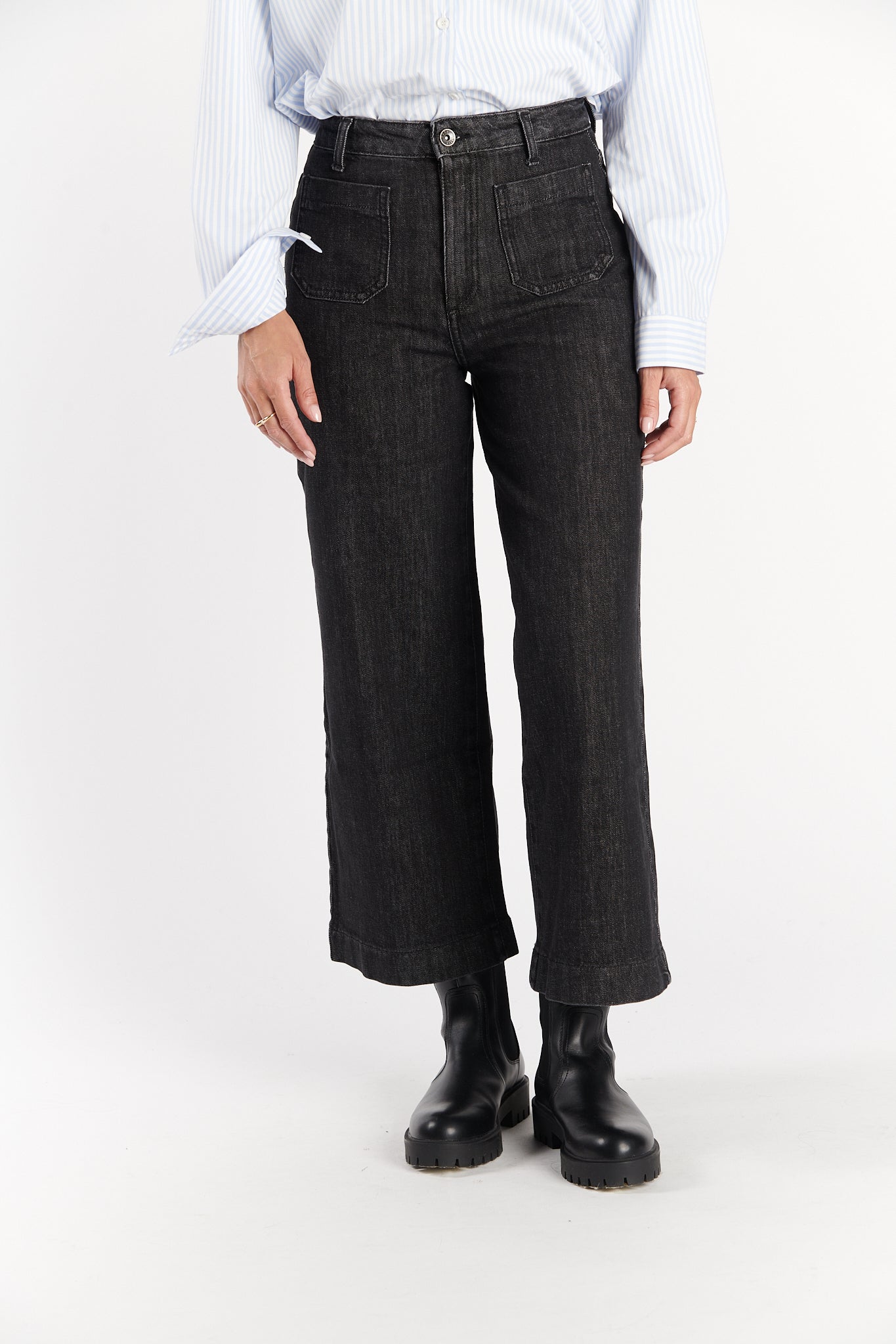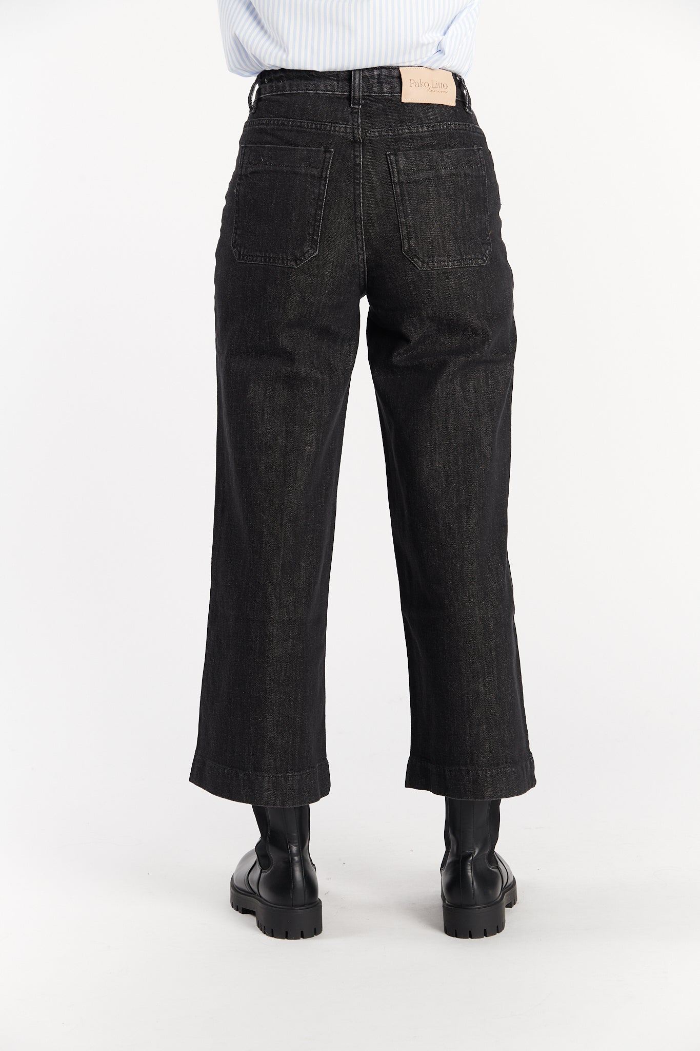 Icône du vestiaire féminin, le jean évasé se modernise avec une coupe 7/8ème au tombé élégant. Sa taille haute met en valeur la silhouette tandis que ses poches plaquées apportent une touche authentique. Décliné dans un denim noir profond, il devient un allié facile à associer, aussi bien pour un look casual de journée que pour une tenue chic en soirée.