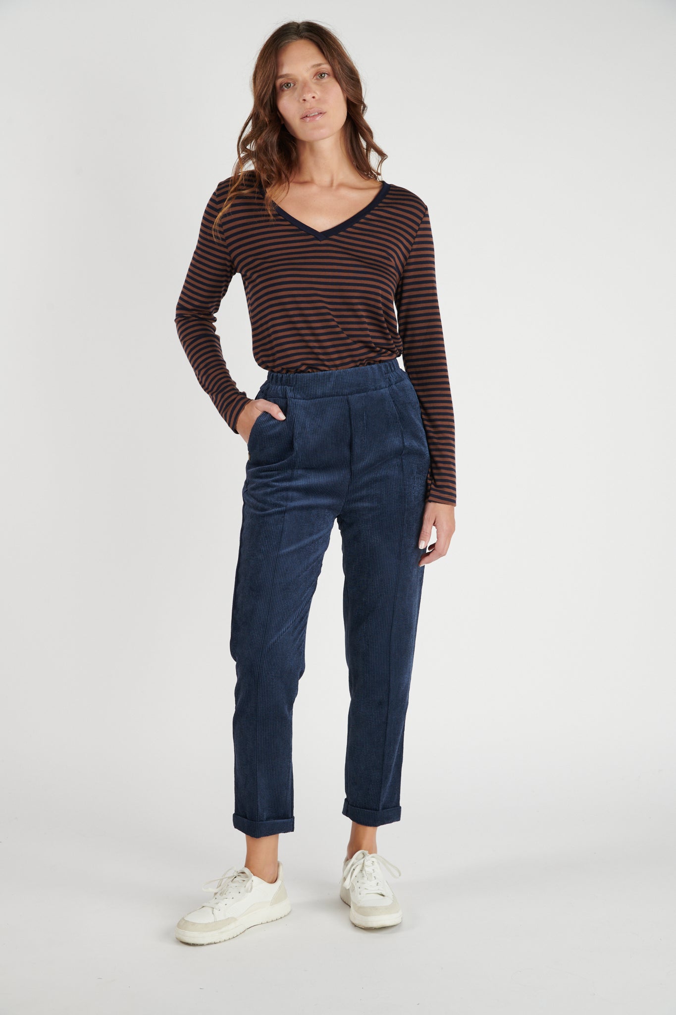 Allure décontractée et matière douce : le pantalon Dean séduit par son velours côtelé épais marine, idéal pour la saison automne-hiver. La taille élastiquée garantit un confort optimal, tandis que sa coupe 7/8e à ourlets dynamise la silhouette. Grâce à ses poches italiennes à l'avant et ses poches passepoilées à l'arrière, il est à la fois chic et décontracté, ce qui lui donne un look à la fois élégant et pratique.