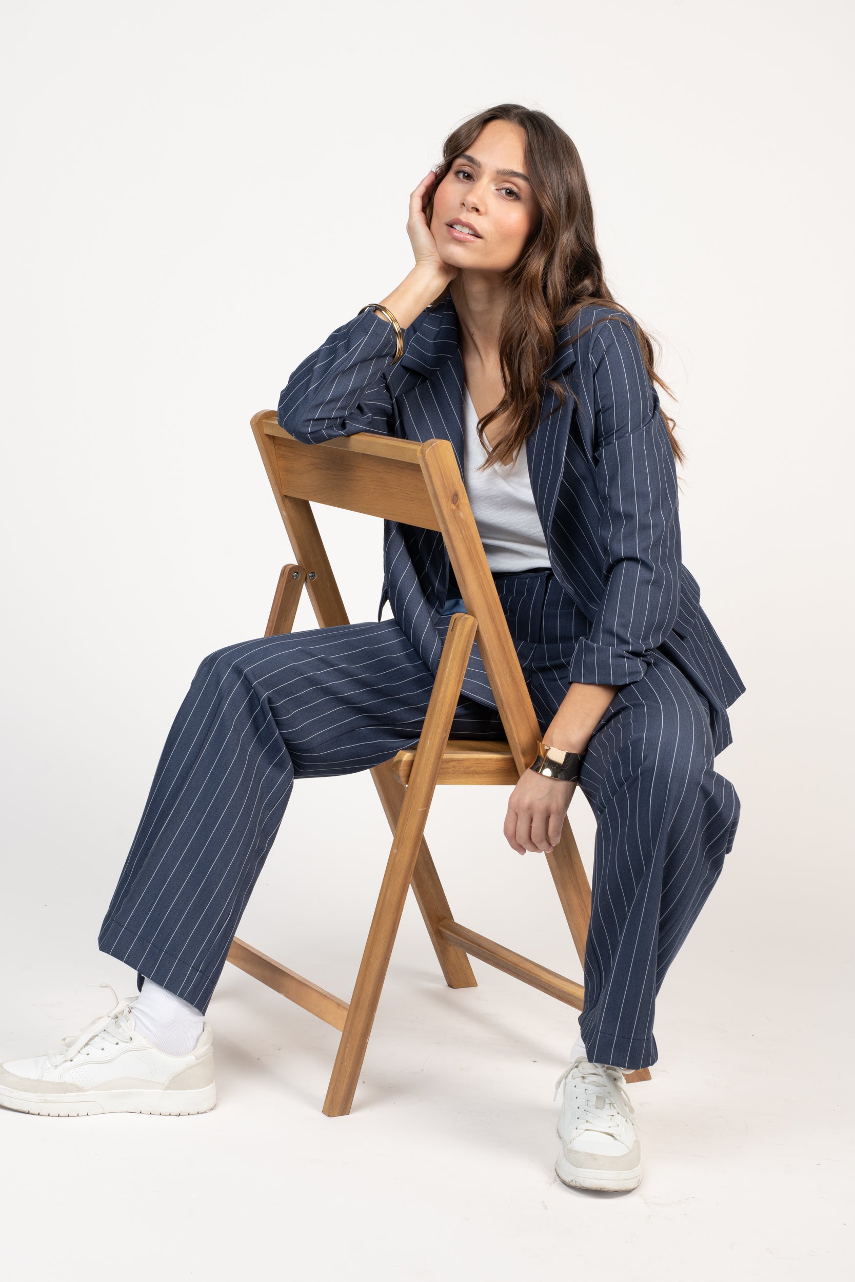 Le pantalon Éden Pako Litto apporte une touche city chic à vos silhouettes grâce à ses fines rayures verticales sur fond bleu denim. Sa coupe longue évasée allonge la jambe et crée une allure élégante, tout en restant facile à porter au quotidien. Confectionné dans une matière confortable au tombé fluide, il accompagne les mouvements avec légèreté. Sa taille structurée avec passants et fermeture boutonnée assure un maintien net, tandis que ses poches latérales ajoutent une note pratique. À associer avec un t-shirt blanc pour un look minimal, ou avec le gilet et la veste coordonnée pour une tenue plus habillée.