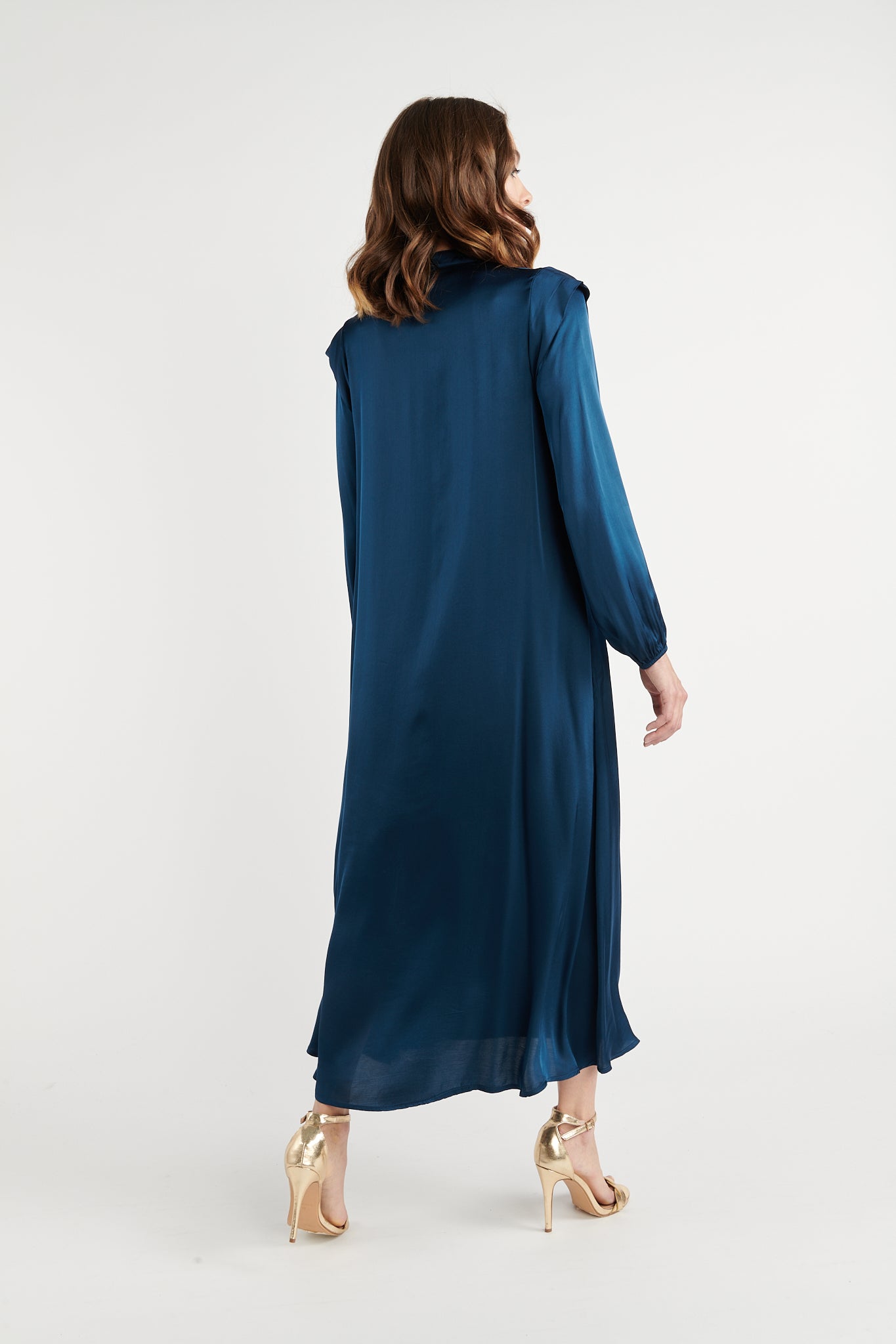 Pour une silhouette fluide et sophistiquée on opte pour la robe satinée Burton couleur bleu pétrole, en 100% viscose. On craque totalement pour ses volants aux épaules, son encolure en V, ses poches italiennes latérales et ses manches longues serrées aux poignets. On ajoute la ceinture Barnabé dorée à la taille pour un look cintré et accessoirisé.