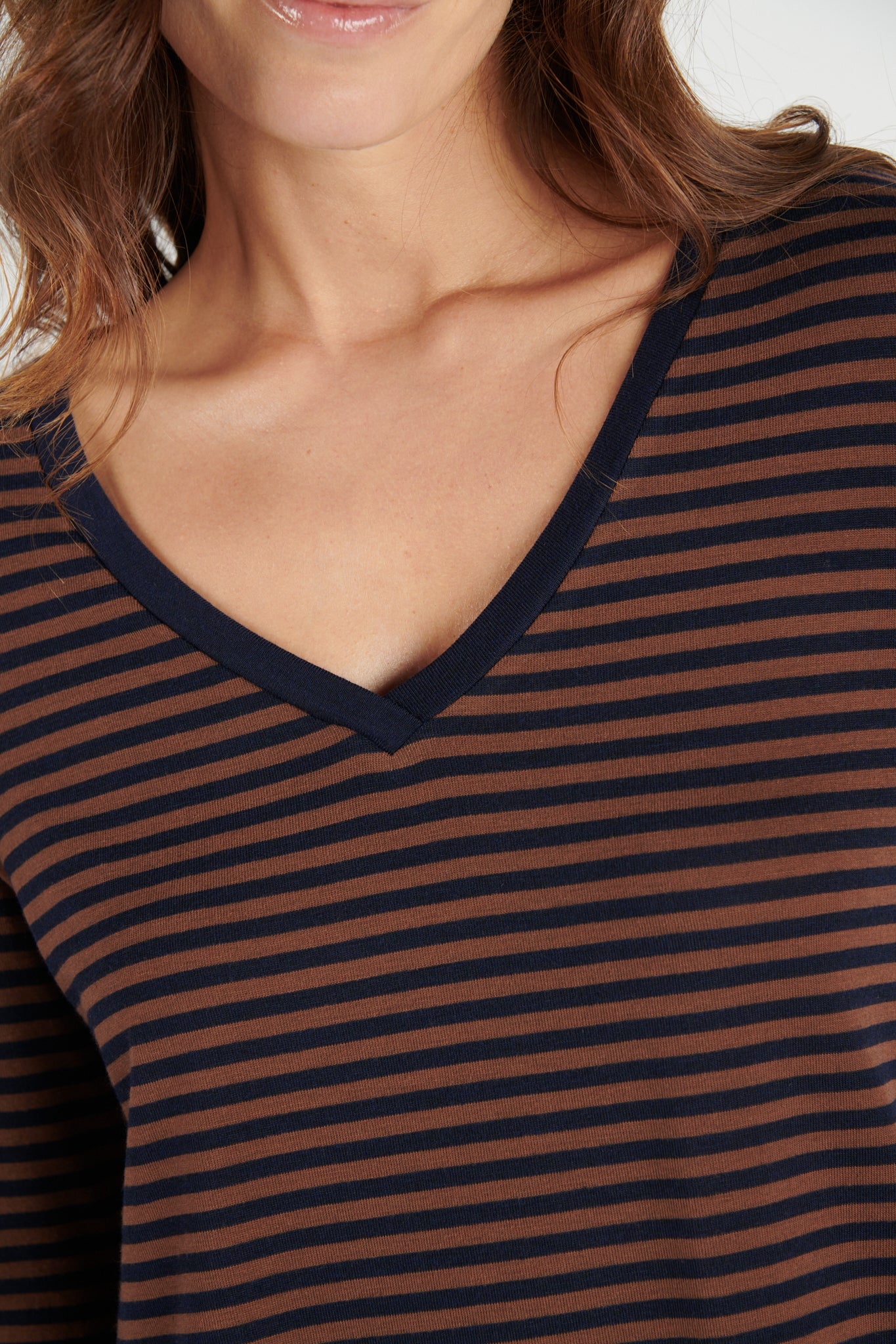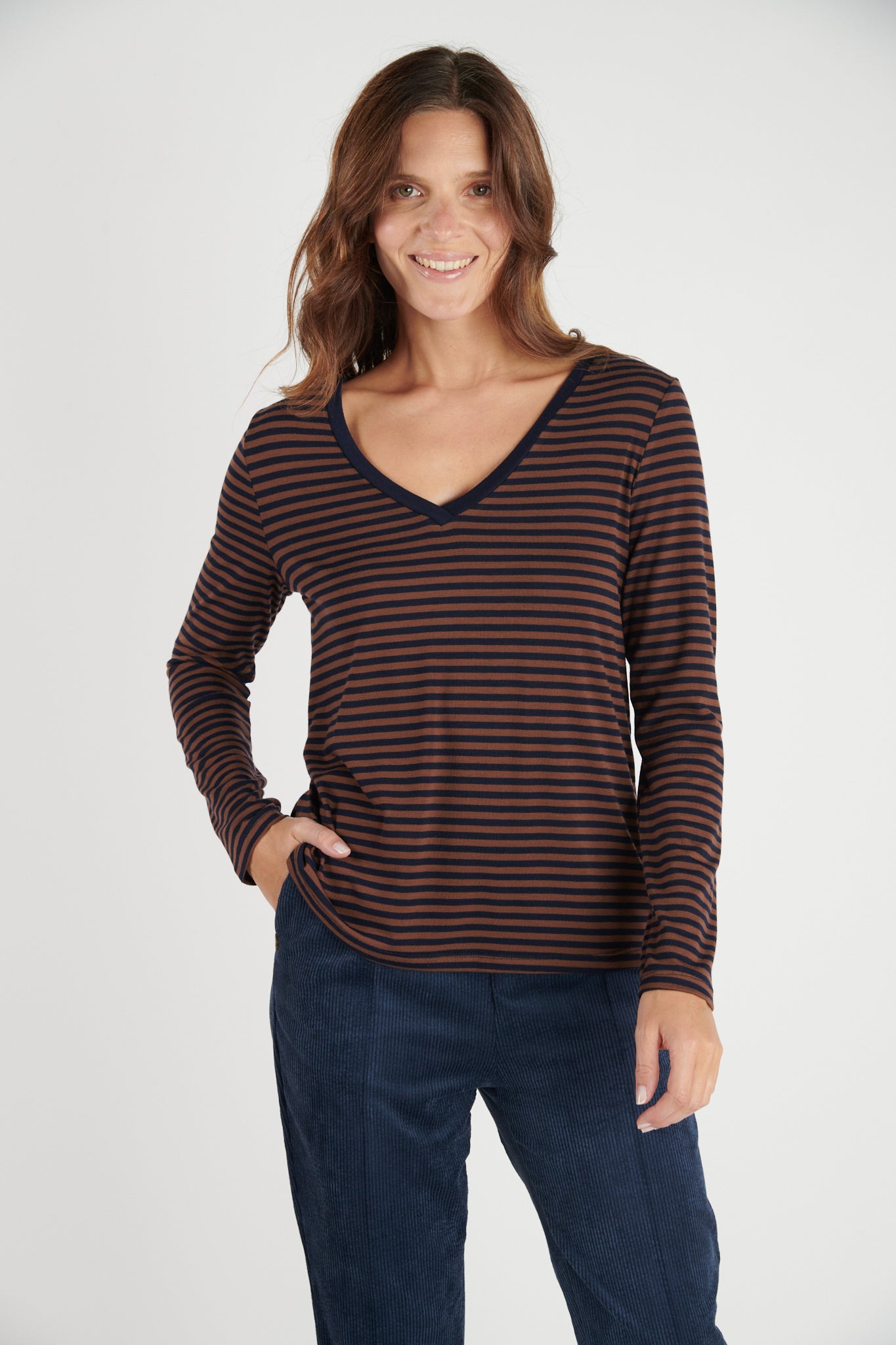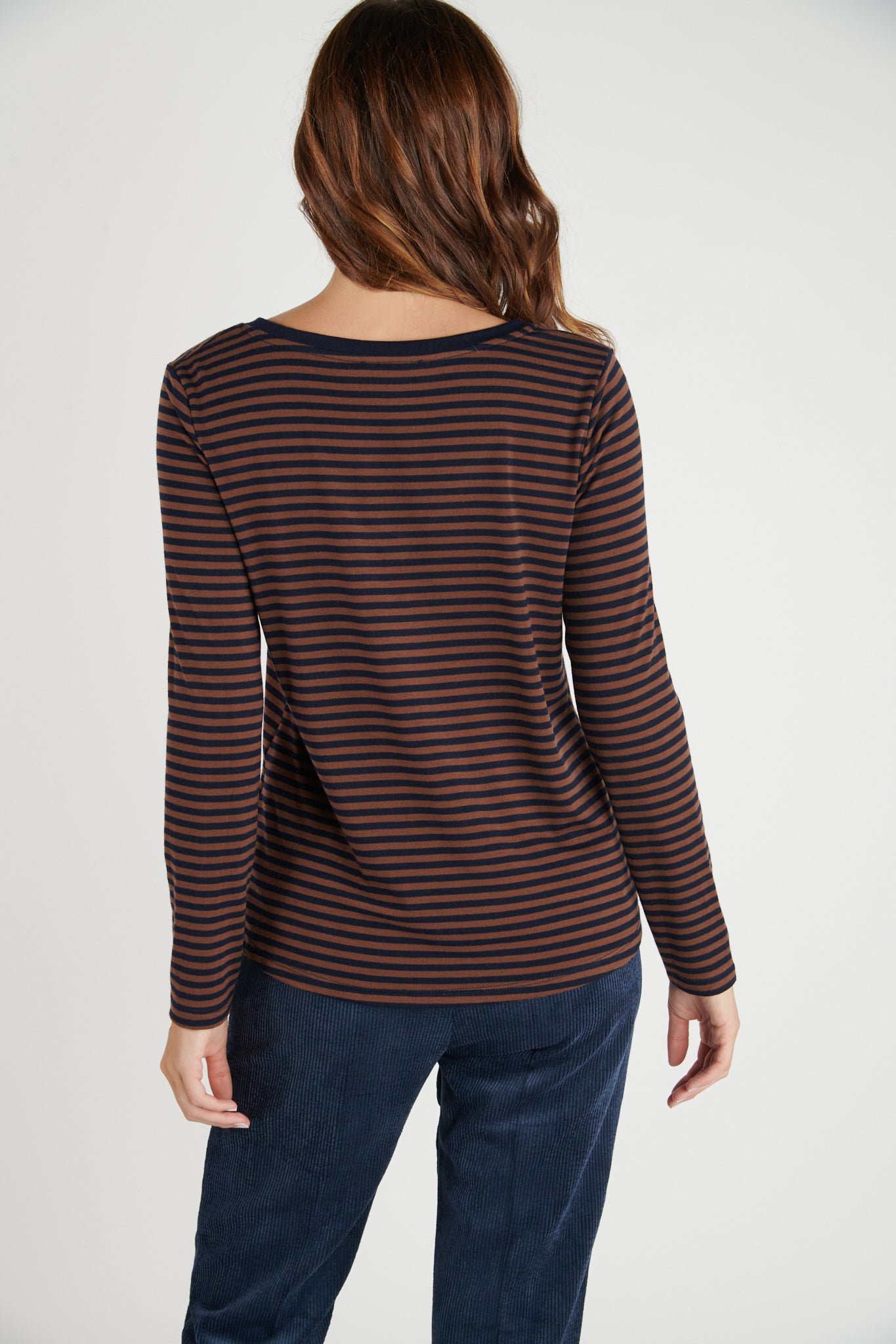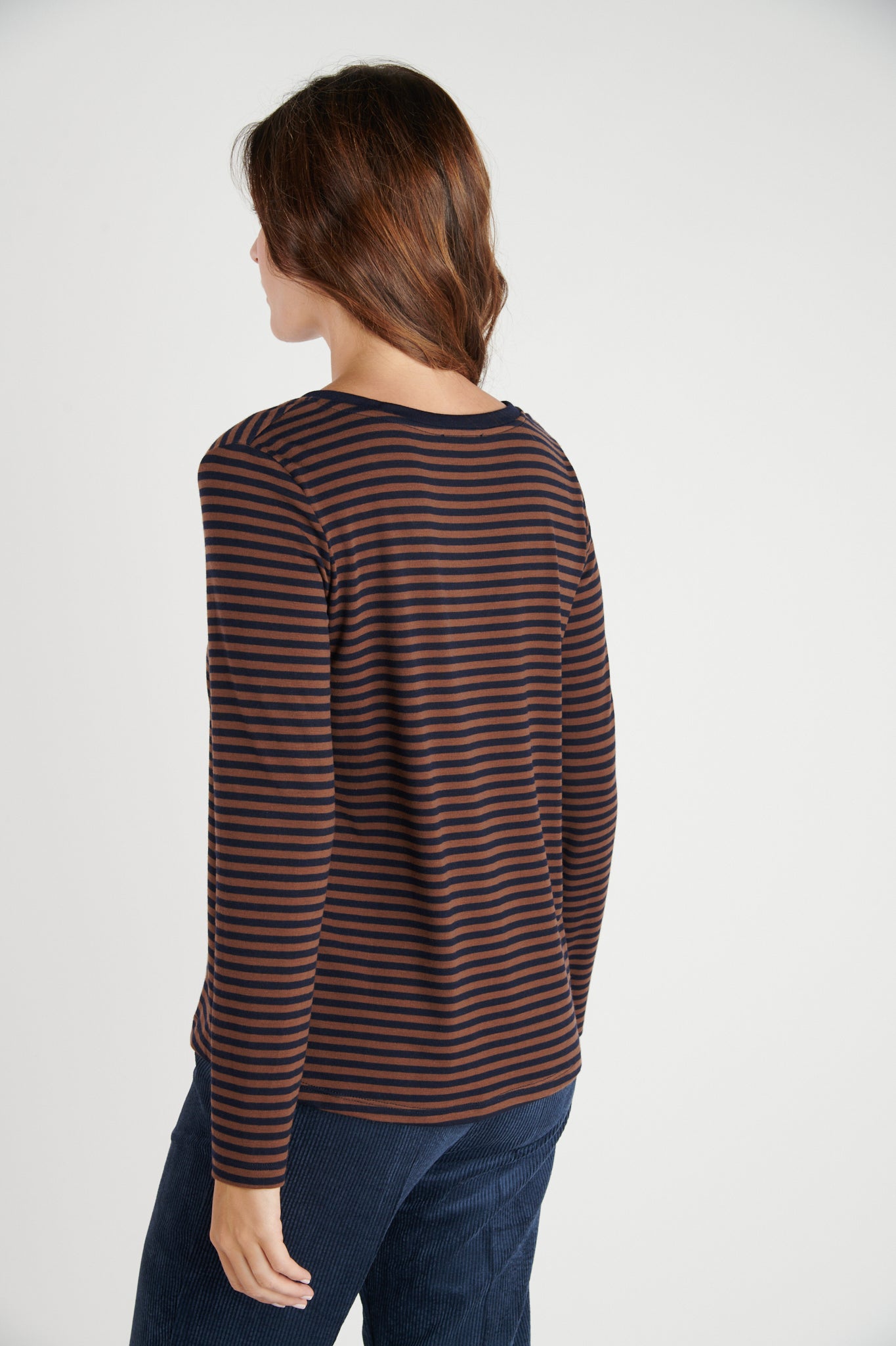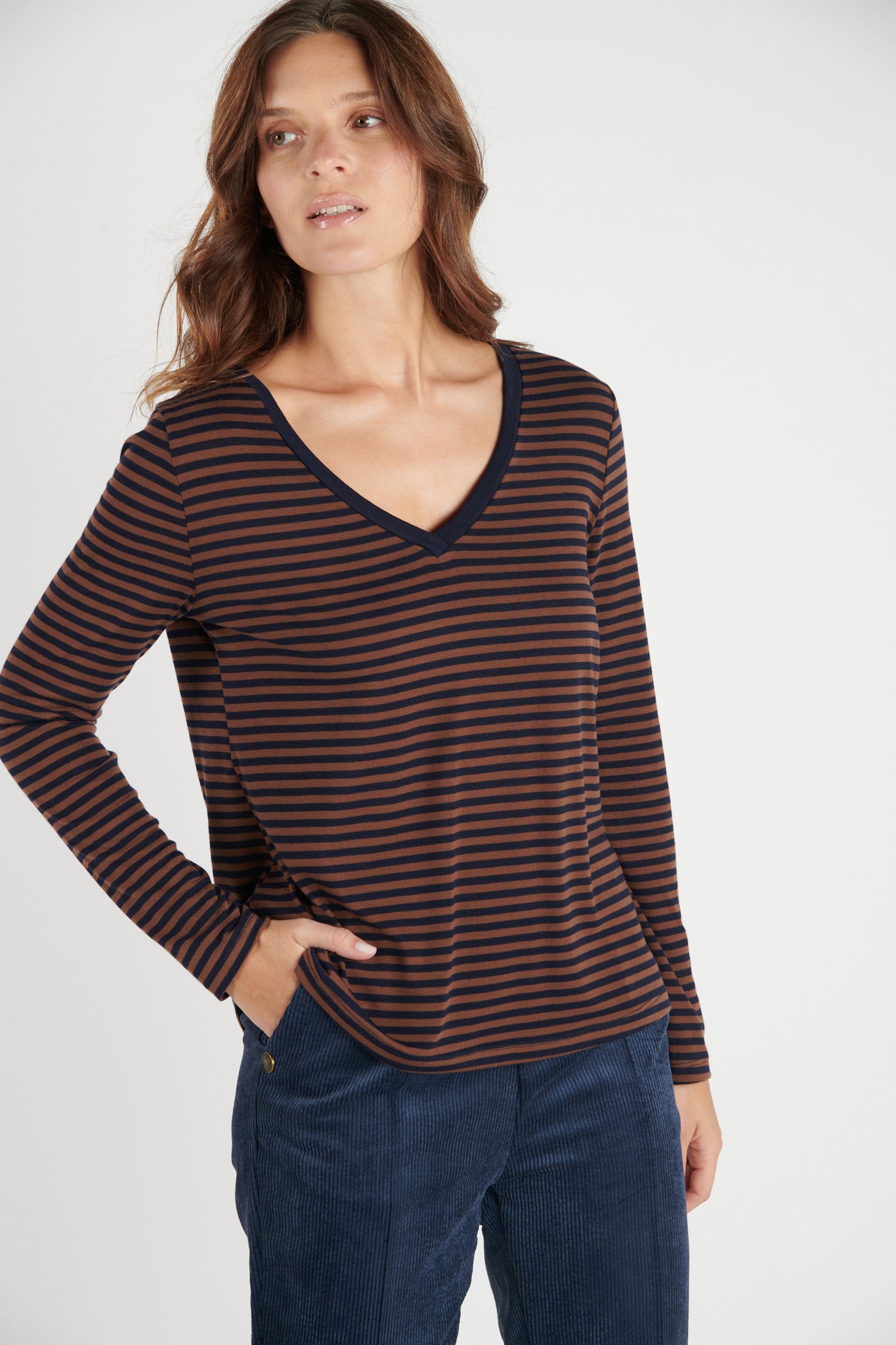 Véritable incontournable, la marinière se réinvente avec le t-shirt Badiallo. Ses rayures châtaigne et marine, son col V et ses manches longues en font un essentiel du dressing. À porter avec un jean et des baskets pour un look moderne et décontracté, tout en simplicité.